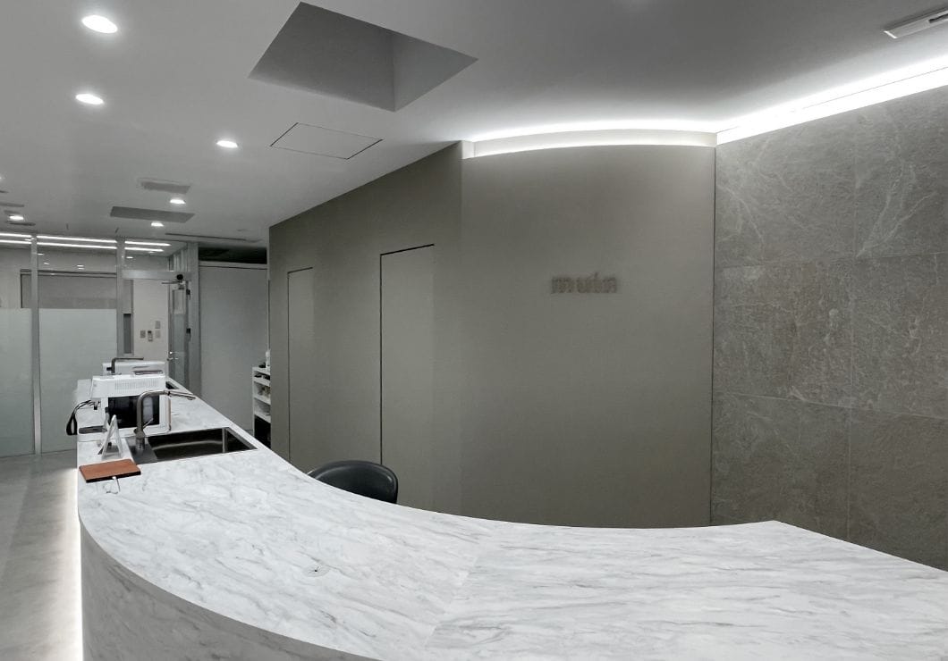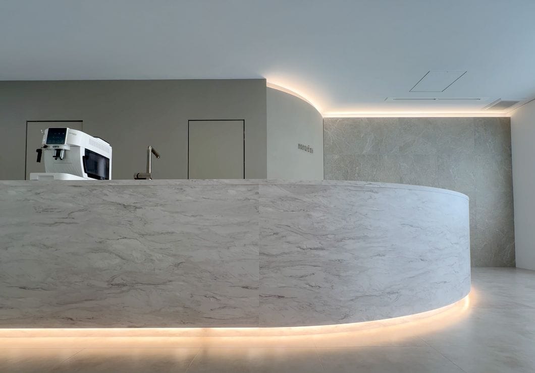 やわらかく弧を描くカウンター、光で輪郭をな ぞることで空間に静かな落ち着きを生み出しています。医療の場でありながら、どこかホテルのロビーのような安心感を感じてもらえるようにしました。