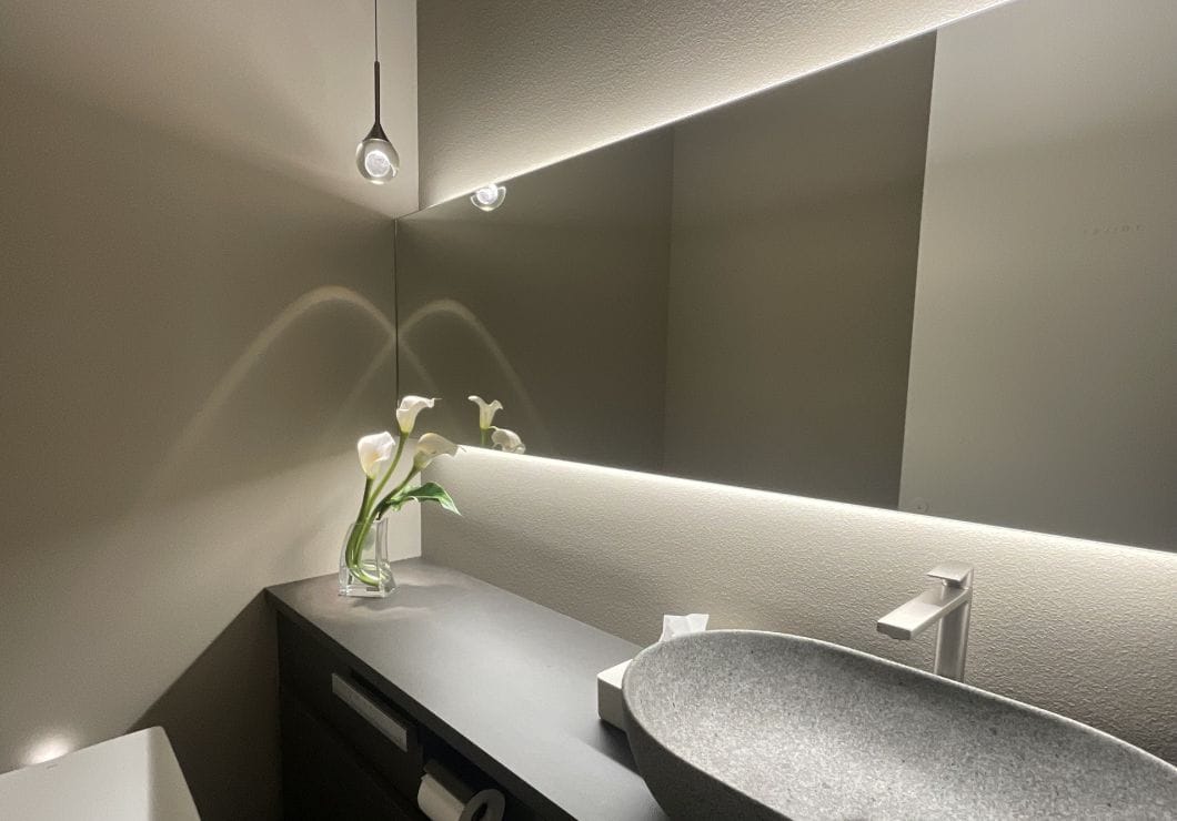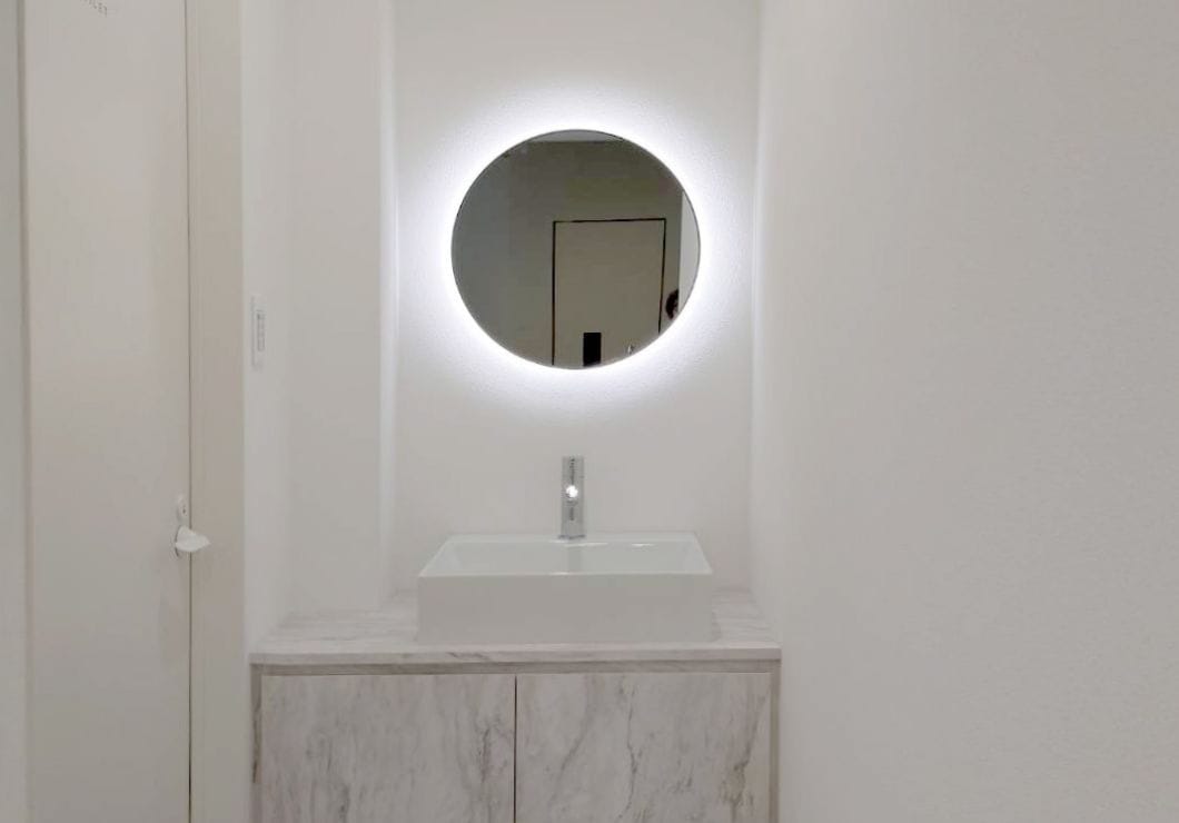 実はかなりこだわった空間です。照明や鏡の大きさ配置、革調にまとめたシンク周り、さらには冷暖房完備です。